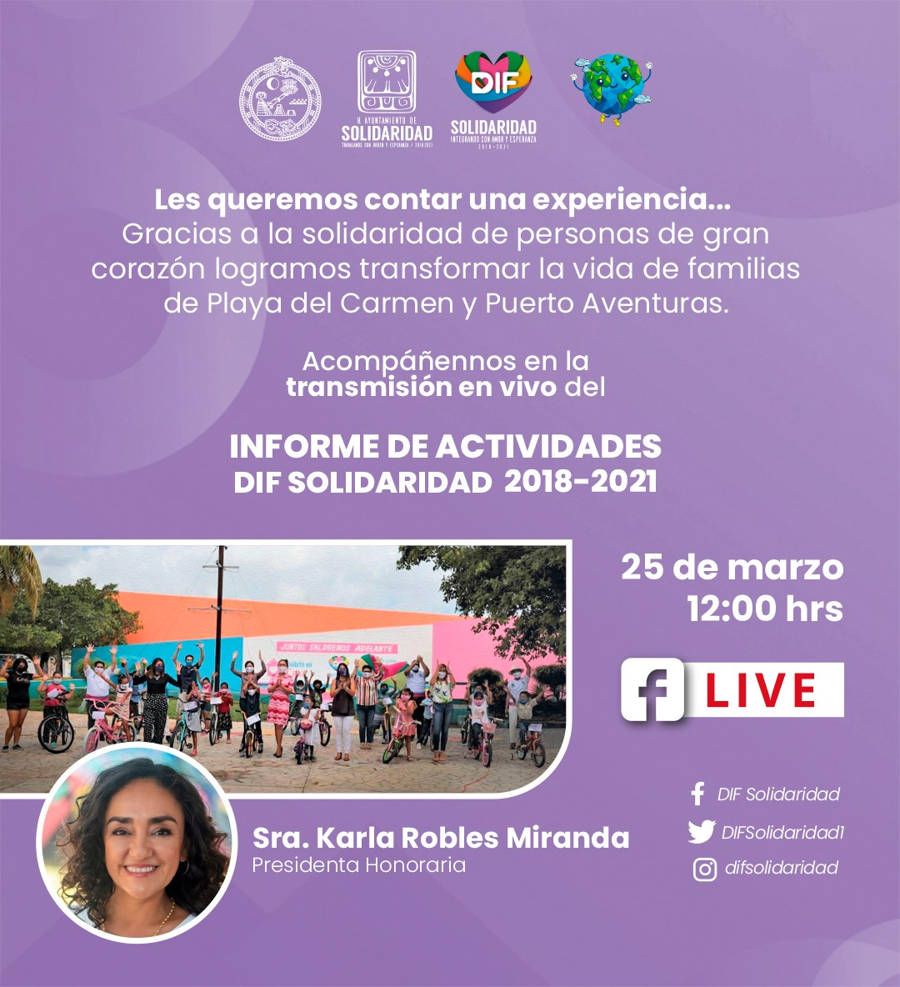 La presidenta honoraria del DIF Solidaridad, Karla Robles Miranda, rendirá su informe de actividades 2018-2021 donde dará a conocer las labores realizadas por dicho organismo y la ampliación de la cobertura al abrir nuevos espacios como lo son los enlaces en Villas del Sol y en Zazil Ha, para llevar servicios y asistencia humanitaria a los solidarenses.