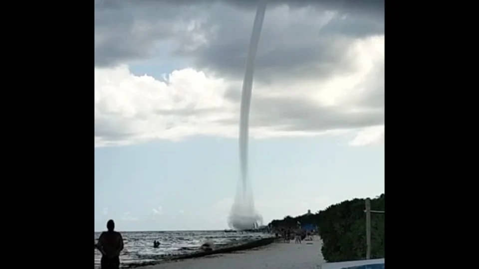 En grabaciones compartidas en redes sociales, se observa el momento en que la tromba se formó mar adentro, frente a la zona de Playacar. El embudo, bien definido, se extendía desde la base de la nube hasta la superficie del mar, levantando rociadores visibles a gran distancia.