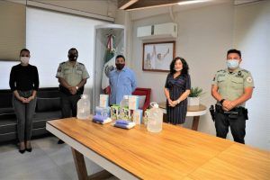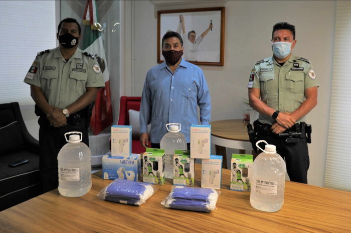 La entrega consistió en cubrebocas, así como en tres oxímetros de pulso, tres scanners infrarrojos para medir la temperatura, alcohol gel al 70% y guantes de látex, mismos que fueron recibidos por el oficial de la Guardia Nacional, José Francisco Ruiz Madrazo, encargado de la Subestación de la Coordinación de Batallón de Seguridad en Carreteras e Instalaciones en Quintana Roo de la Guardia Nacional y el Suboficial Sanabria González Arturo.