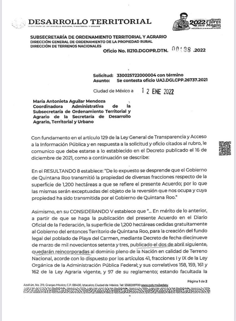 Mediante una solicitud de transparencia para aclarar esta situación, ciudadanos de Playa del Carmen solicitaron información del estatus legal de las vialidades contempladas en el acuerdo de reincorporación a bienes nacionales del fundo legal de Playa del Carmen y es ahí donde María Antonieta Aguilar Mendoza, coordinadora administrativa de la subsecretaría de ordenamiento territorial y agrario de Sedatu informó lo que aquí se consigna y que está disponible en imagen para que lo pueda consultar.