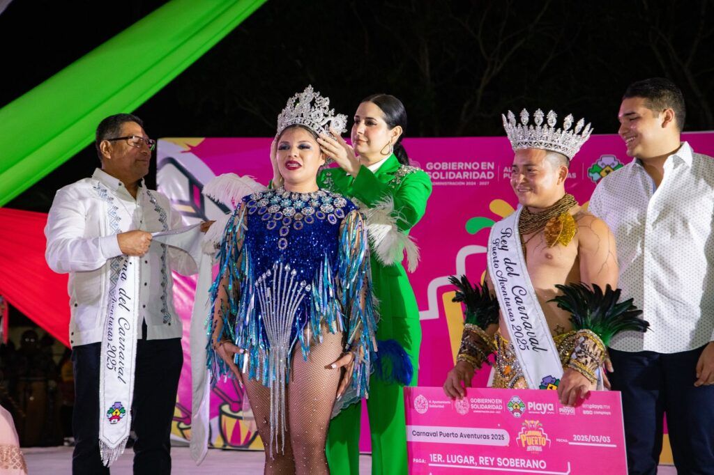 Puerto Aventuras, Quintana Roo, 4 de marzo de 2025.— En medio de un ambiente de algarabía, música y diversión, la presidenta municipal Estefanía Mercado coronó a los soberanos del “Carnaval del Pueblo” Puerto Aventuras 2025, Jeremmy Jissele y Demmys Ariel, así como a las reinas y reyes infantiles, de la discapacidad, adulto mayor, juveniles y de la alegría, en la nueva Plaza Cívica, ante cientos de habitantes de la Alcaldía.