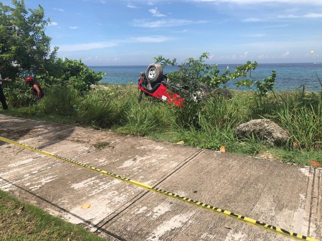 Los hechos se registraron a las 10:58 de la mañana en la costera sur a la altura del hotel Cozumel and Resort, cuando turistas a bordo de un jeep rojo de la rentadora “Chac” al parecer por conducir a exceso de velocidad se impactaron contra una palmera del camellón central para después atravesar el carril de norte a sur y terminar en la zona rocosa de playa con el vehículo volcado.