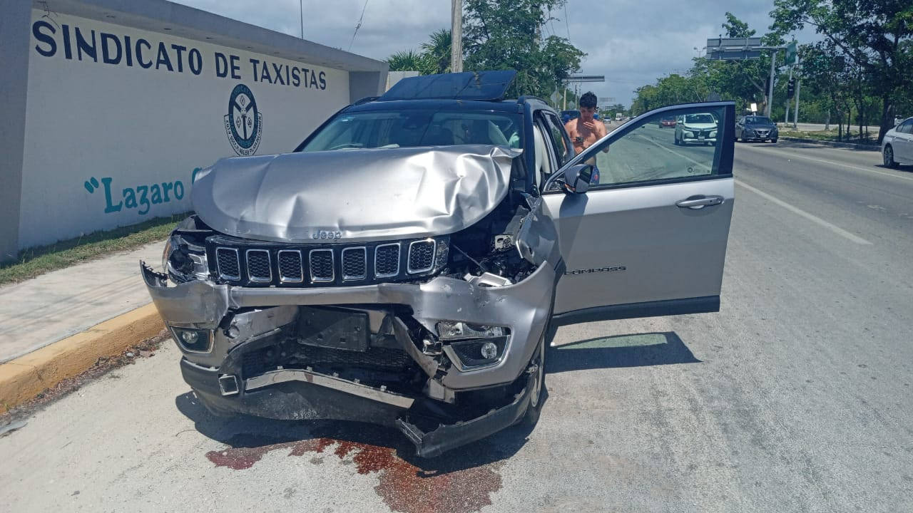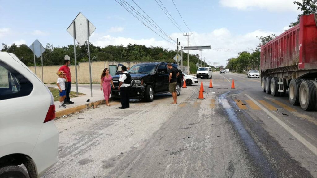 Esta tarde, ocurrió un accidente vial sobre el boulevard Playa del Carmen, cuando una camioneta gris marca Jeep se impactó con una Suburban color negro al realizar la primera una vuelta en “U” en zona prohibida.