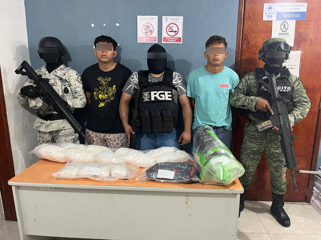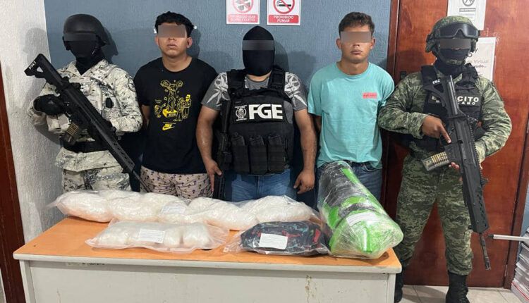 La Fiscalía General del Estado informa que, en colaboración con la Secretaría de la Defensa Nacional (Sedena) y la Guardia Nacional, detuvieron en flagrancia a Alan de Jesús “N” y Julio César “N” por su probable participación en delitos contra la salud, tras asegurarles diversos paquetes con presunta droga, con un peso aproximado de 12.5 kilogramos.