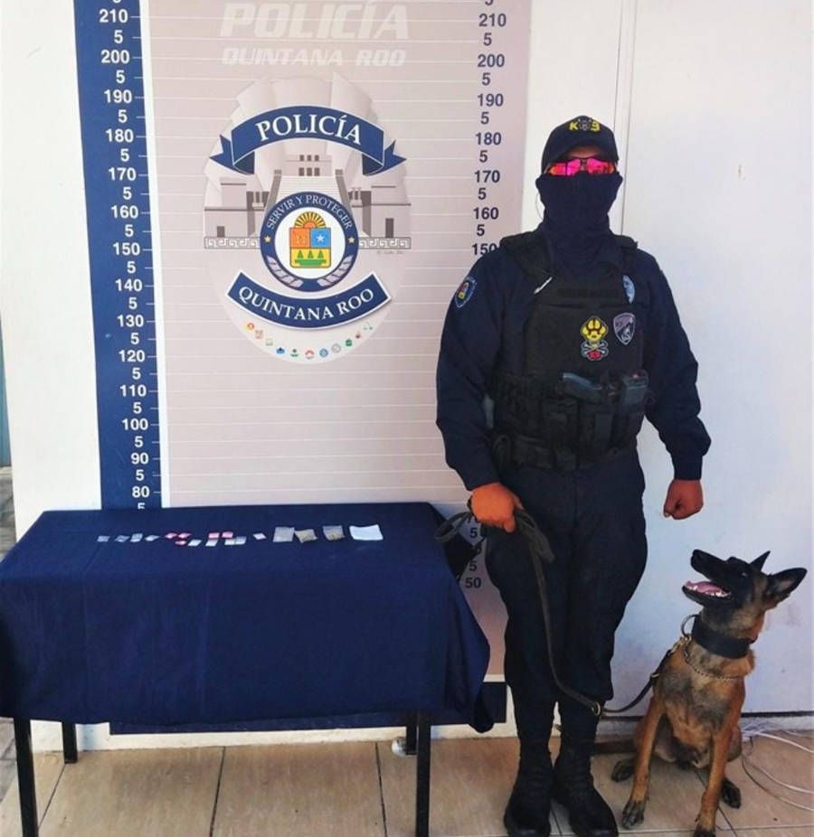 Elementos de la policía Quintana Roo, en apoyo de su binomio canino lograron detectar en un buzón varias dosis de drogas.