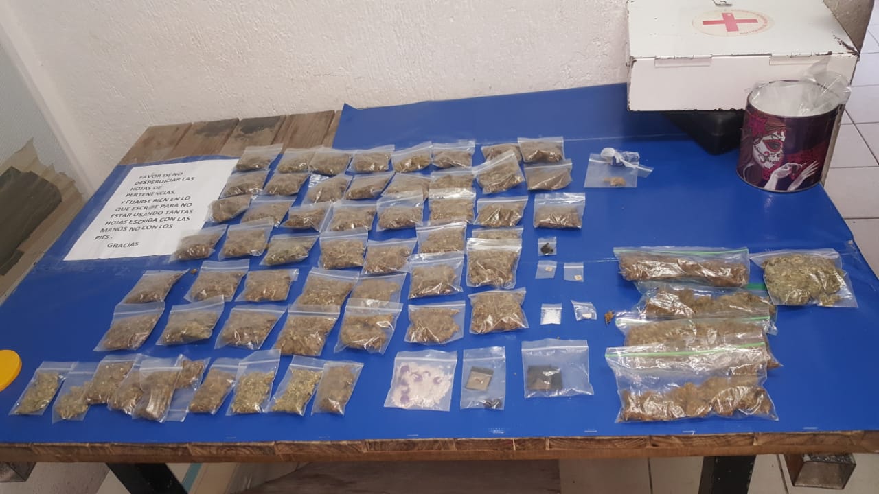Los elementos policiacos procedieron a realizarles la revisión de rutina, en la que se les encontró hierba seca con las características propias de la marihuana, sustancia sólida de color blanco con características de la droga conocida como piedra, sustancia cristalina con características del cristal y polvo blanco con las propiedades de la cocaína.