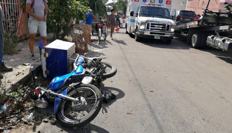 Trágico accidente de tránsito se registró sobre la calle 1 sur en la colonia Ejidal, cuando el conductor de una camioneta arrolló a un repartidor de una motocicleta, diligenciero de una refaccionaria pereciendo de manera instantánea, para liberar el cuerpo fue necesaria la intervención de una grúa de la empresa Quality.