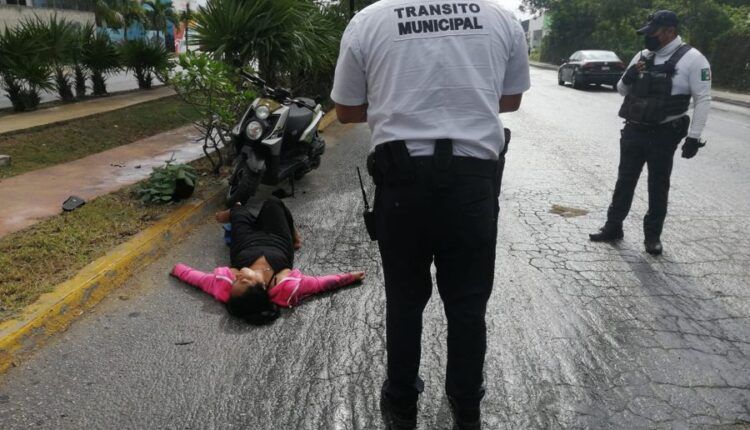 Con posible pérdida del pie podría terminar la conductora de una motocicleta marca Vento que circulaba sobre la avenida 28 de julio, y quien antes de llegar al boulevard playa del Carmen derrapó debido al pavimento mojado y las malas condiciones del mismo.