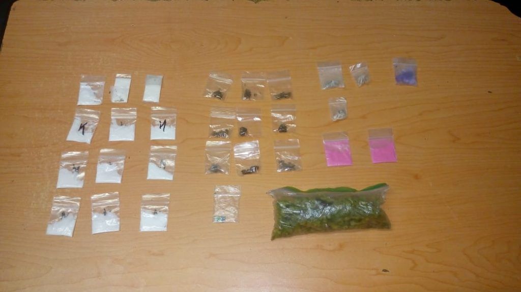 Entre las pertenecías de la mujer los oficiales encontraron una bolsa con vegetal verde y seco con las características propias de la droga conocida como mariguana, 12 bolsas con una sustancia a determinar de forma granulada color café, una bolsa con cuadros pequeños de cartón similar a la droga conocida como LSD, 2 bolsas con polvo de color rosa, una bolsa con 9 pastillas de color morado, 12 bolsas con polvo de color blanco con las características propias de la droga conocida como cocaína y un celular.