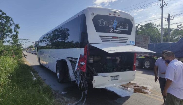 Conductor de autobús de la empresa Del Valle, dedicada a la transportación de personal hotelero, realizó corte de circulación a camioneta cargada de frutas y verduras sobre el boulevard Playa del Carmen, metros adelante del filtro policíaco uno.