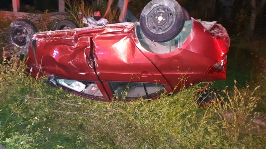 El vehículo aparentemente tipo Chevrolet Aveo color rojo acabo volcado con las llantas al aire, y completamente destrozado, automovilistas que pasaban alrededor de las 2:20 de la madrugada por la zona dieron aviso a la línea de emergencia 911.