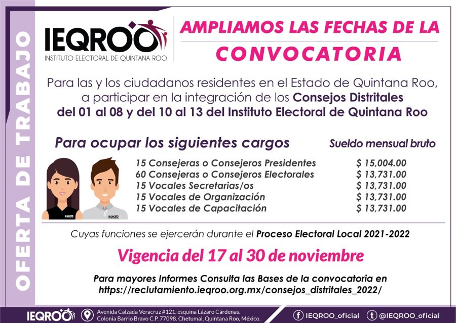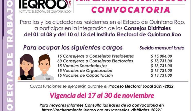Integrantes del Consejo General del Instituto Electoral de Quintana Roo (IEQROO), en Sesión Extraordinaria aprobaron la ampliación de la convocatoria del 17 al 30 de noviembre del año en curso para el registro de las y los aspirantes a Consejeras/os Presidentes, Consejeras/os y Vocales de los Consejos Distritales en razón de que no se cumplió con el número mínimo de ciudadanos requeridos para ocupar los cargos referidos y cuyas funciones ejercerán durante el Proceso Electoral Local 2021-2022.