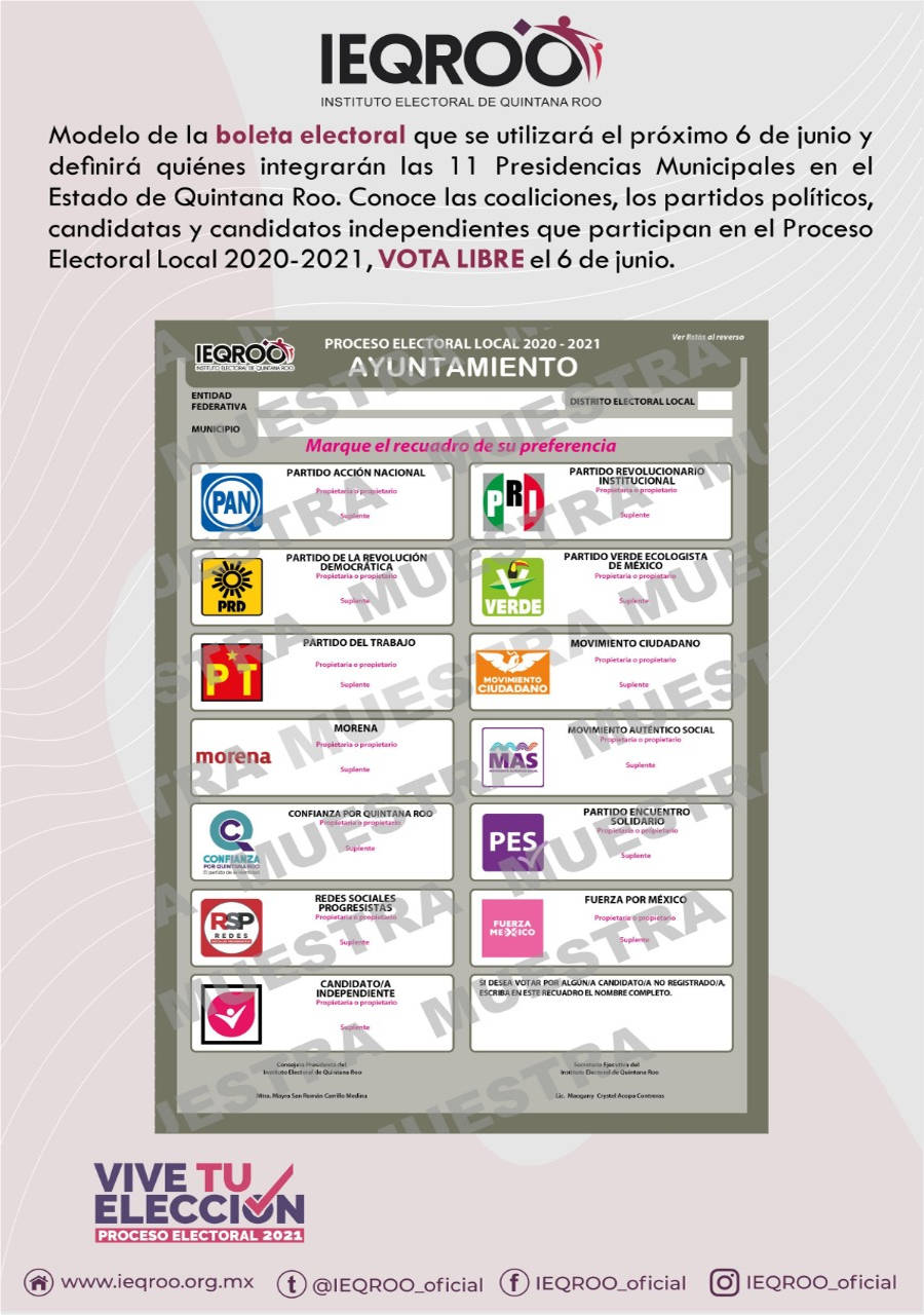 En ese sentido, se dio a conocer la documentación electoral que será utilizada en la jornada electoral, a celebrarse el próximo 6 de junio del año en curso, con los diseños definitivos de la documentación electoral para dicho Proceso Electoral Local 2020-2021, siendo estos los siguientes: con emblemas, la boleta electoral de la elección para el Ayuntamiento; acta de escrutinio y cómputo de casilla de la elección para el Ayuntamiento; acta de escrutinio y cómputo de casilla especial de la elección para el Ayuntamiento; acta de escrutinio y cómputo de casilla levantada en el consejo municipal de la elección para el Ayuntamiento.