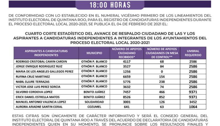 Rodrigo Cristóbal Carín Cardín; Othón P. Blanco; 4117 apoyos ciudadanos recibidos, 68 apoyos ciudadanos en mesa de control, umbral requerido 2586.