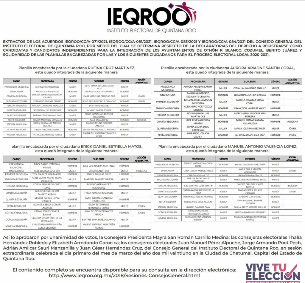 El Instituto Electoral de Quintana Roo 8IEQROO) informó que determinó procedente la declaratoria de derecho a registrarse a las candidaturas independientes de los ayuntamientos en el proceso electoral 2020-2021 a las plantillas encabezadas por: