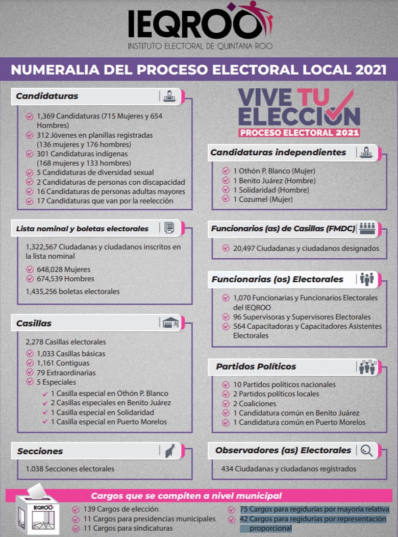 El Instituto Electoral del Estado de Quintana Roo informó de la numeralia del proceso electoral local 2021 quedando de la siguiente manera: