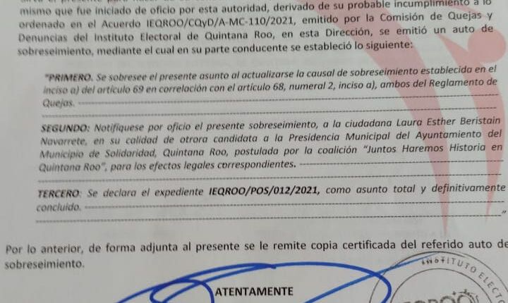 La Comisión de Quejas del Instituto Electoral de Quintana Roo (Ieqroo) sobreseyó el proceso ordinario sancionador 12/2021 iniciado en contra de la otrora candidata a la presidencia municipal de Solidaridad, Laura Beristain Navarrete, por lo que este proceso ha quedado descartado.