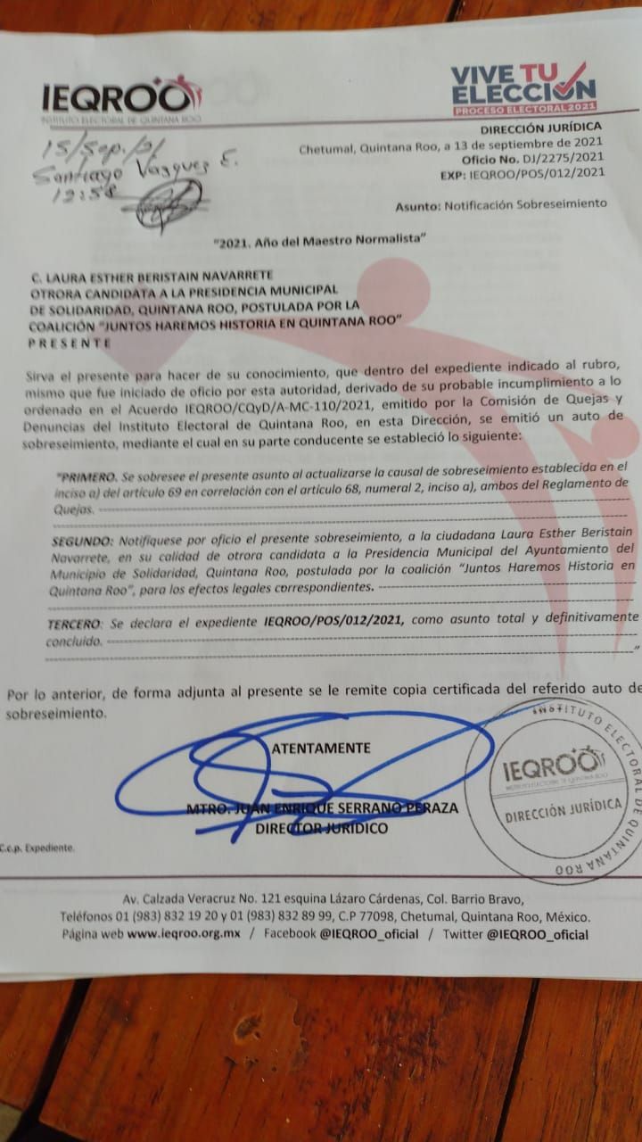 En un oficio firmado por Juan Enrique Serrano Peraza, director jurídico del Ieqroo, se notifica que este expediente ha sido decretado como un asunto “total y definitivamente concluido”.