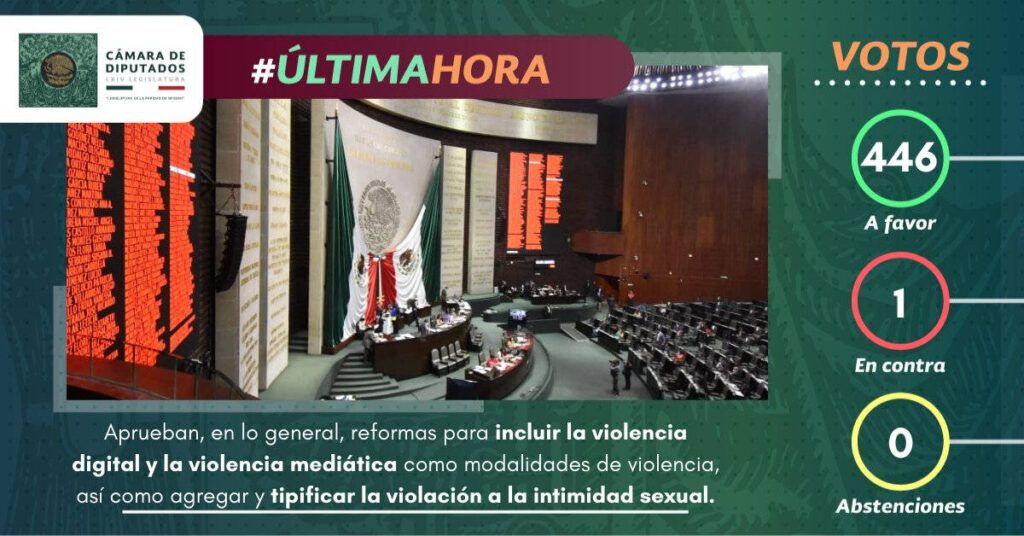 El pleno de la Cámara de Diputados aprobó en lo general la llamada Ley Olimpia que sanciona la violencia digital y tipifica el delito de violación a la intimidad sexual con una sanción de tres a seis años de cárcel.
