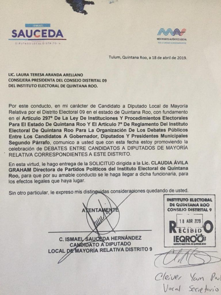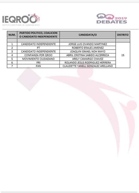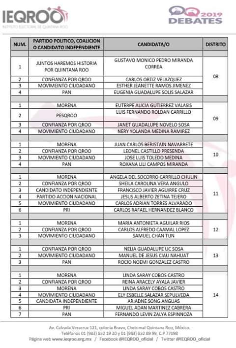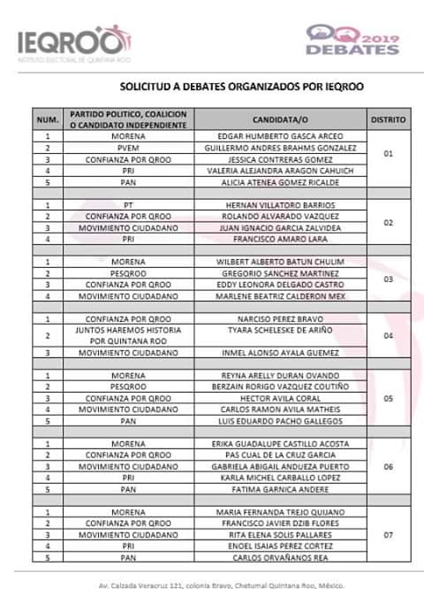 El departamento de prensa del Instituto Electoral de Quintana Roo circuló mediante su grupo de difusión una lista de los candidatos que solicitaron debate en los distintos distritos del estado, sin embargo esta lista contiene errores ya que fueron excluidas algunas solicitudes y hubo cambio de distritos de algunos candidatos.