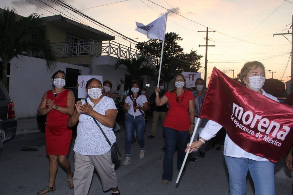 Solidaridad, Quintana Roo, 22 de abril de 2021. ¡Con el grito de ¡ya llegó, ya está aquí, Laura va a seguir! Laura Beristain, candidata de Morena, Partido Verde, MAS y PT a la presidencia municipal de Solidaridad, fue recibida por vecinos de la colonia Bellavista, aquí donde ya se vive la Cuarta Transformación.