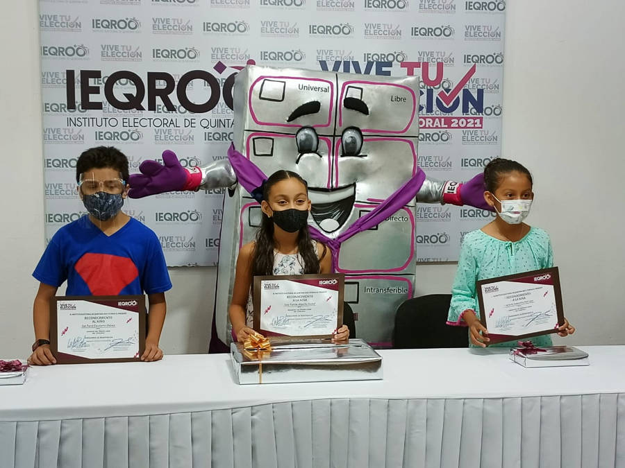 Asimismo, felicitó a las niñas Sally Faride Alamilla Hadad y Arleth Samantha Pat Lara, ganadoras del primer y segundo lugar y al niño Ian Farid Escalante Chávez ganador del tercer lugar, y los invitó a seguir expresando mediante el arte, lo que piensan y sienten en todo momento, y que esta no sea ni la primera ni la última vez que participen en los concursos y eventos del IEQROO.