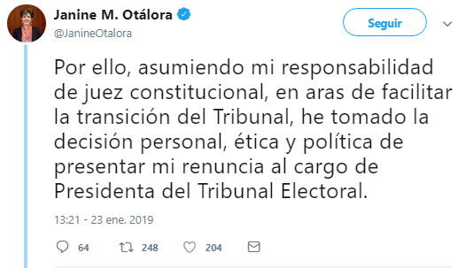 En su comunicado de hoy, anunció que deja su cargo de presidenta pero continuará con su mandato constitucional de magistrada de la Sala Superior.
