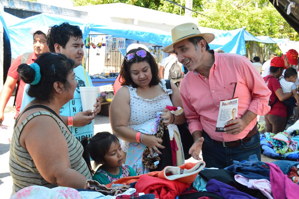Las banderas del PT también ondean con las de MORENA. Ya se está en el tianguis. Juan Carlos dirige un mensaje a la gente: “Amigos de la Colosio, sé que el principal problema de esta colonia es la tenencia de la tierra. La Desarrolladora de la Riviera Maya ha impedido que tengamos certeza de nuestro patrimonio. De llegar al Congreso del Estado, legislaré para sacudirnos este yugo, nos vamos apoyar en el Gobierno Federal, no más fraudes, ni arbitrariedades. Voten este 2 de junio por MORENA”.