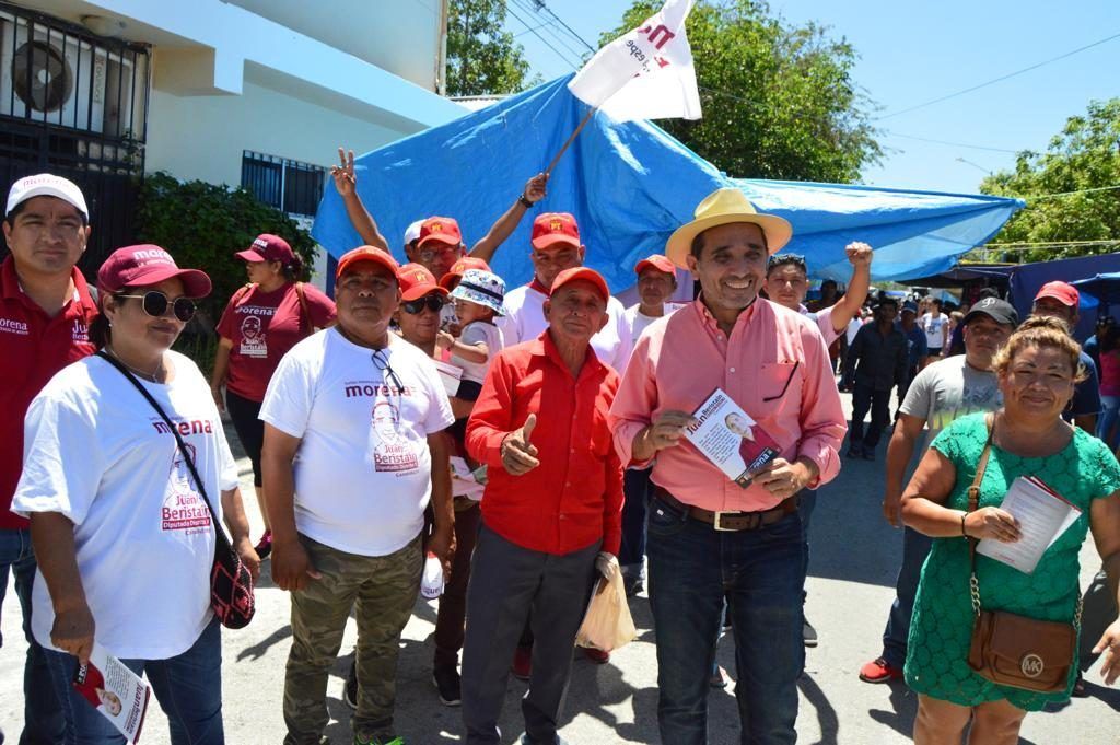 “En la Cuarta Transformación ya no cabe la corrupción”, entona la porra del candidato de Morena a diputado, Juan Carlos Beristain. Es Domingo de Resurrección. “Vamos por el renacimiento del país, a ganar con MORENA el Congreso de Quintana Roo”, afirma el abanderado, a su paso por la colonia Colosio.