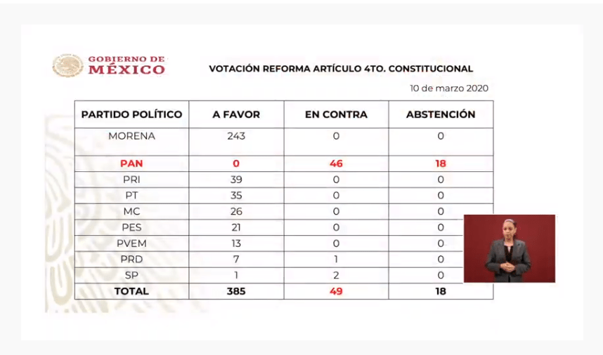 Al inicio de la conferencia de prensa matutina presentó una tabla en la cual se muestra el voto en contra – o abstenciones- de la bancada del PAN, uno del PRD y dos sin partido.