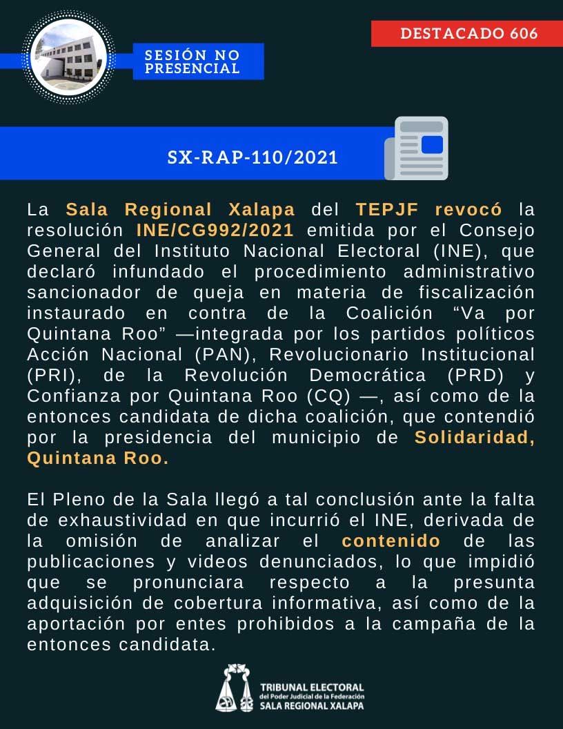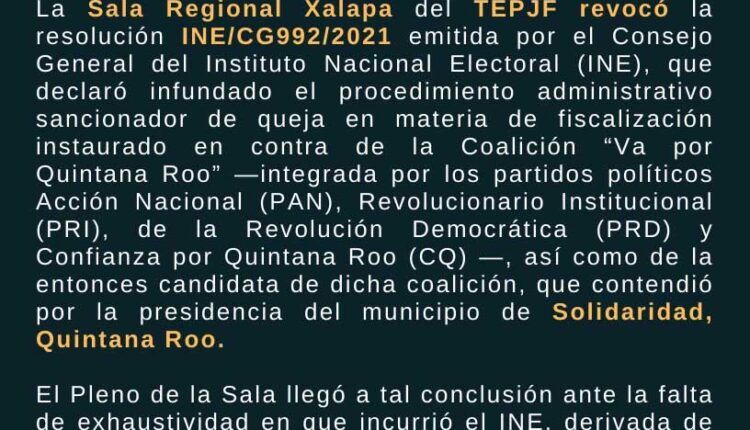 La Sala Regional Xalapa del Tribunal Electoral del Poder Judicial de la Federación (TEPJF) revocó hoy una resolución del Instituto Nacional Electoral (INE), por la que se deslindaba a Lili Campos Miranda, entonces candidata a la presidencia municipal de Solidaridad, y a la coalición “Va por Quintana Roo” (PAN-PRI-PRD-CpQ) de diversas publicidades en Facebook que presuntamente equivalían a adquisición de cobertura informativa y entrega de especies.