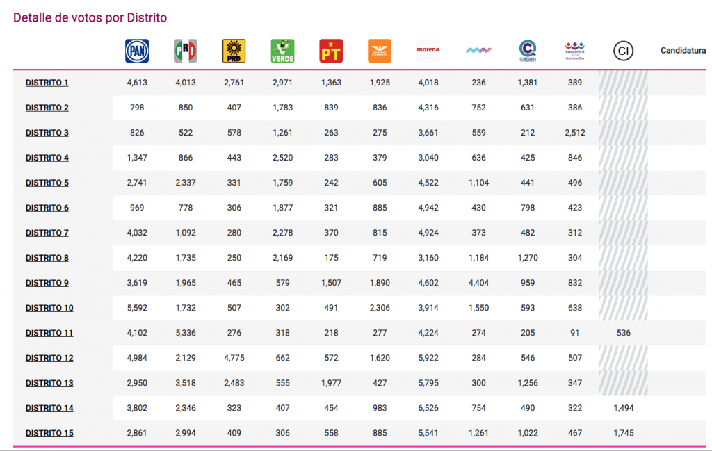 Con 100 por ciento de las actas capturadas en el Programa de Resultados Preliminares (PREP), el Congreso del Estado de Quintana Roo para la XVI Legislatura estaría conformado con 11 diputados de mayoría relativa de la coalición Juntos Haremos Historia por Quintana Roo, encabezada por Morena, Partido Verde Ecologista de México y Partido del Trabajo; tres diputados de mayoría de la coalición Orden y Desarrollo por Quintana Roo, conformada por el PAN, PRD y Encuentro Social, y una por el Partido Revolucionario Institucional.