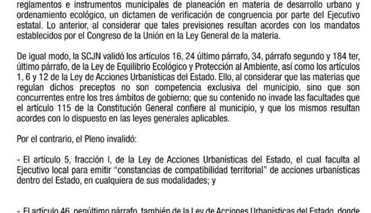 Mediante un comunicado, la Suprema Corte de Justicia de la Nación informó que inició formalmente el estudio de constitucionalidad de la polémica ley de asentamientos humanos, ordenamiento territorial y desarrollo urbano, así como la ley de Equilibro ecológico y protección al ambiente junto con la ley de acciones urbanísticas aprobadas por la legislatura anterior en el estado de Quintana Roo.