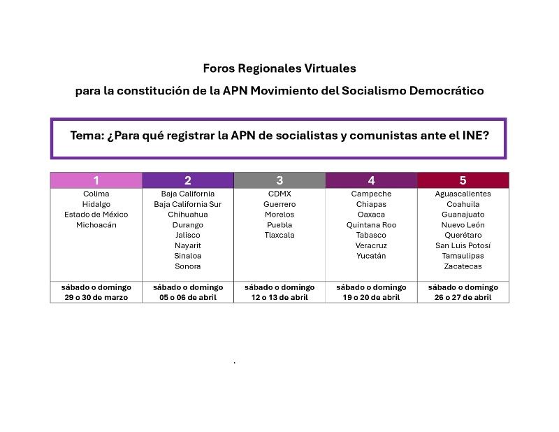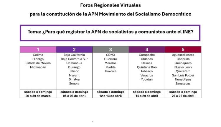 El foro regional programado para el sureste, que incluirá a Quintana Roo, se llevará a cabo el 19 o 20 de abril y servirá para explicar los objetivos del Movimiento del Socialismo Democrático y convocar a quienes deseen sumarse a esta iniciativa.