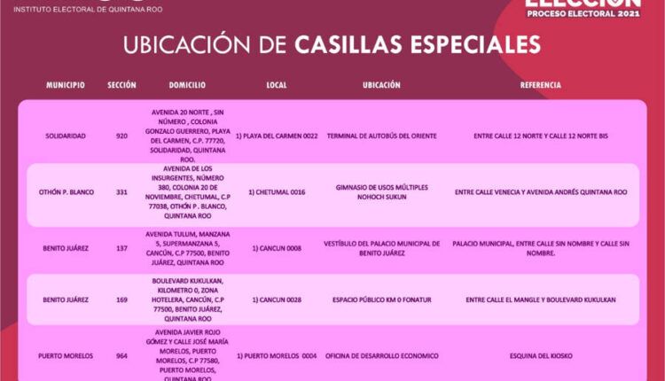 El Instituto Electoral de Quintana Roo dio a conocer la ubicación de cinco casillas especiales en los diferentes municipios para ejercer el voto este domingo 6 de junio.