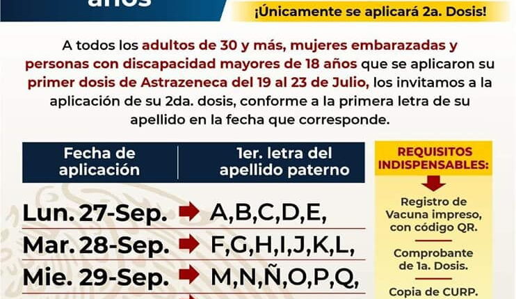 En este sentido, comentó como parte del Plan Nacional de Vacunación de la Federación, en coordinación con la Secretaría estatal de Salud y el municipio, continuarán las jornadas a partir del día 27 de septiembre, cuando podrán acudir quienes su primer apellido comience con las letras A, B, C, D y E; mientras que el día 28 corresponderá a F, G, H, I, J, K y L.