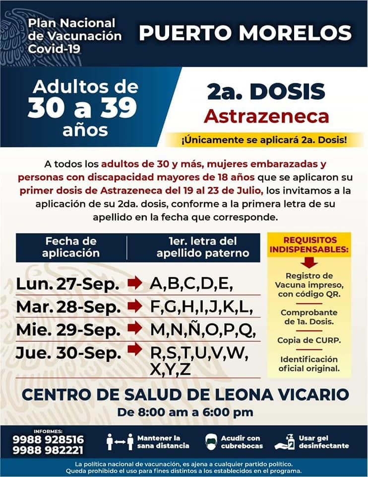 Aplicarán en Puerto Morelos segunda dosis a personas de 30 a 39 años .