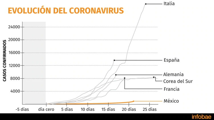 A 20 días de que se dieran a conocer los primeros casos de contagiados de coronavirus en México (actualmente hay 93), el país no avanza igual que las cifras exponenciales de otros países como España, Francia, Alemania o Italia, éste último el país que superó la rapidez de contagios mayor.
