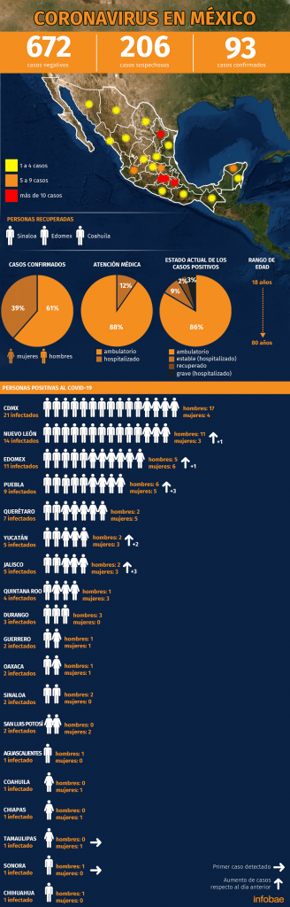 Con once casos nuevos registrados en las últimas 24 horas, el director general de Epidemiología del Gobierno mexicano, José Luis Alomía Zegarra, confirmó además, que se tienen 206 casos sospechosos de contagio y que al momento las autoridades sanitarias han descartado 672 casos negativos.