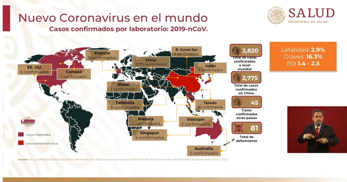 Señaló que se han confirmado 2 mil 820 casos de infectados con coronavirus a nivel mundial, en 13 países. La mayoría de los enfermos se concentra en China, donde reportan 2 mil 775 casos. Han fallecido 81 personas.