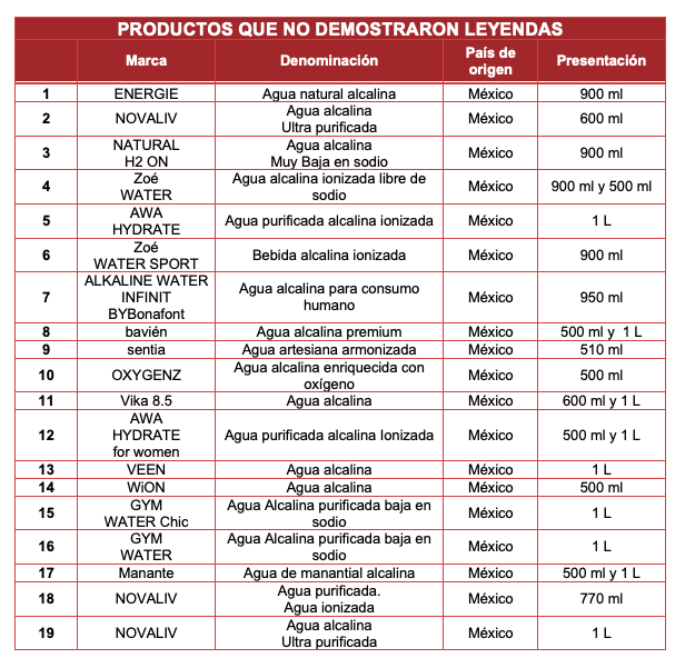 En los productos se encontraron leyendas que ofrecen beneficios que no se demuestran, tales como Alcalinízate, Oxigénate, Equilibra el pH, Equilibra tu salud, Neutraliza radicales libres, Elaborada de manera 100% natural, Fortalece el sistema inmune. Elimina la acidez, Desintoxica, Mantén el pH de tu cuerpo en balance, Agua única y de carácter, Elimina toxinas, Esencial para el equilibrio de tus células, Hidratación inteligente, Hidrátate de forma eficaz manteniendo tu cuerpo en equilibrio.