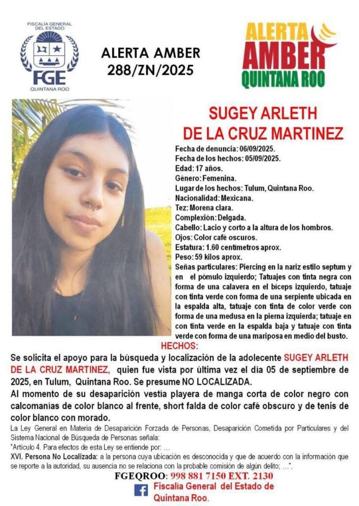 La primera de ellas es Sugey Arleth de la Cruz Martínez, de 17 años. Su descripción física señala que tiene tez morena clara, complexión delgada, cabello lacio corto a la altura de los hombros y ojos cafés oscuros. Posee varias señas particulares muy distintivas: un piercing en la nariz (septum) y otro en el pómulo izquierdo. Además, cuenta con múltiples tatuajes en tinta negra y verde: una calavera en el bíceps izquierdo, una serpiente en la espalda alta, una medusa en la pierna izquierda, un diseño en la espalda baja y una mariposa en el busto. Al momento de su desaparición, vestía una playera negra de manga corta con calcomanías blancas, un short falda café oscuro y tenis blancos con morado.
