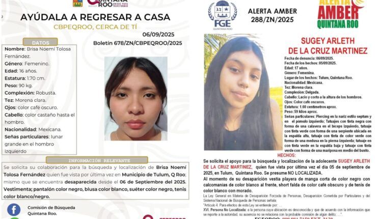 La Fiscalía General del Estado (FGE) y la Comisión de Búsqueda de Personas han activado los protocolos de búsqueda para localizar a dos jóvenes menores de edad, reportadas como no localizadas los días viernes 5 y sábado 6 de septiembre.