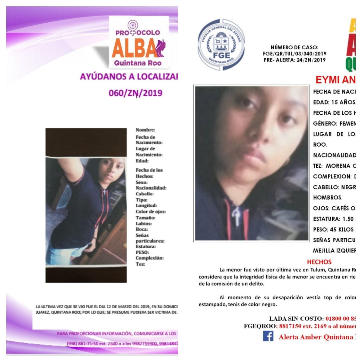 La menor fue visto por última vez en Tulum, Quintana Roo, el día 12 de Marzo del 2019. Se considera que la integridad física de la menor se encuentra en riesgo toda vez que puede ser víctima de la comisión de un delito.