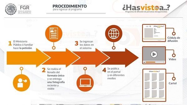 La Fiscalía General de la República (FGR) cuenta con el programa de difusión institucional ¿Has Visto A…? , el cual tiene como objetivo principal brindar apoyo a familiares de personas desaparecidas, a través de cédulas de difusión publicadas en diferentes medios publicitarios. Considerando lo anterior, ¿Has Visto A…? contempla las siguientes estrategias: