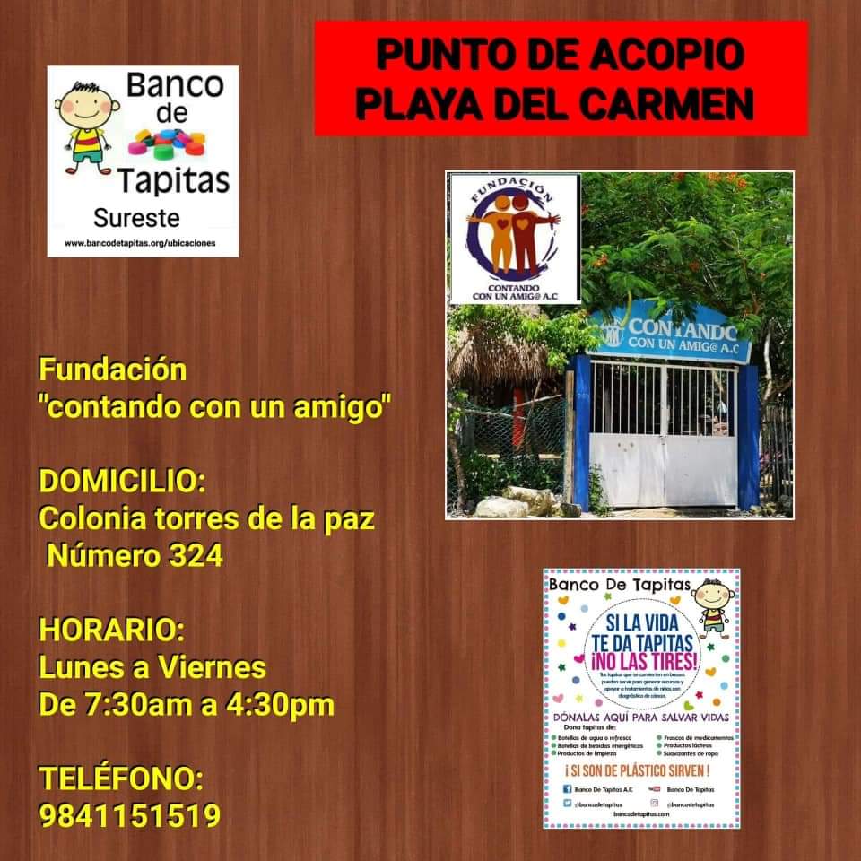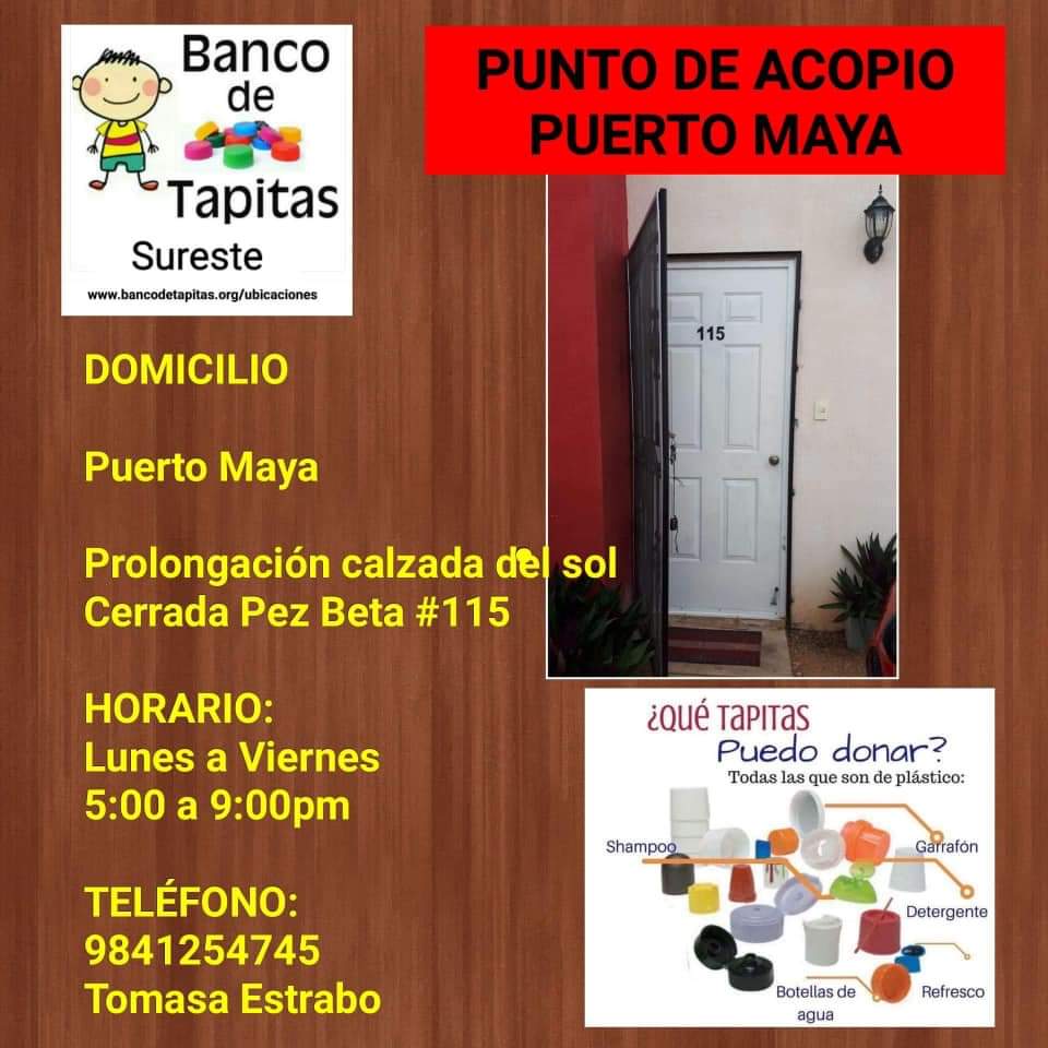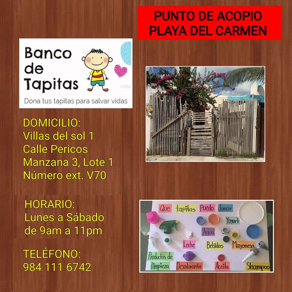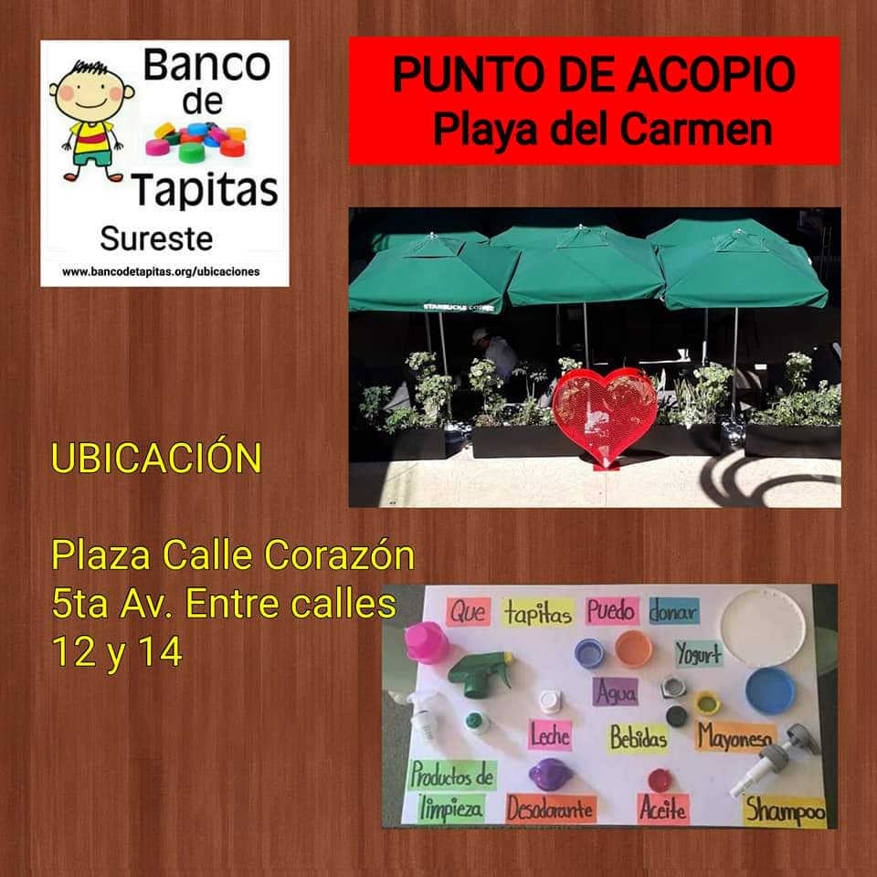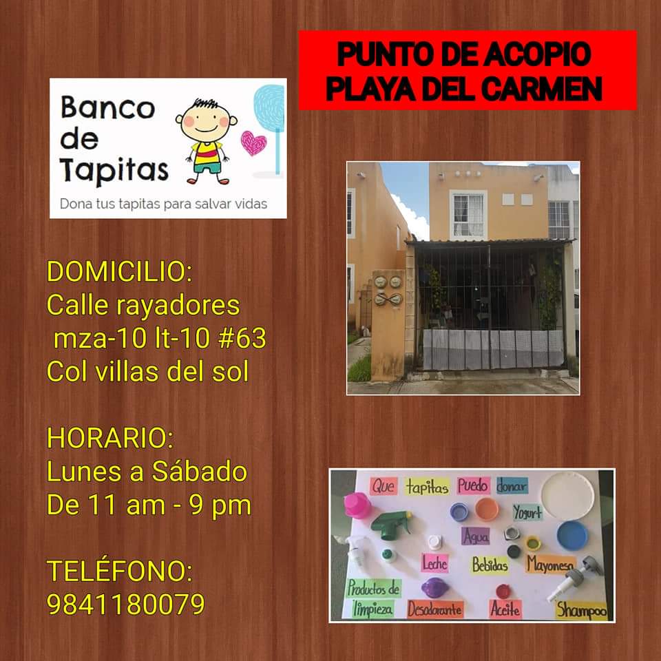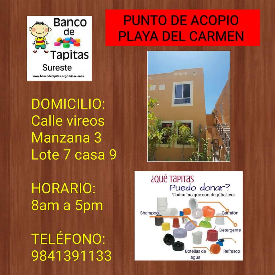 La ubicación de los centros de acopio en la Quinta Avenida, en la colonia Ejido, en el fraccionamiento Villas del Sol y en la colonia Colosio, a donde se pueden llevar todo tipo de tapas de plástico de envases de detergentes, yogurths, refrescos, sueros, de garrafones de agua, siempre y cuando estén limpias.