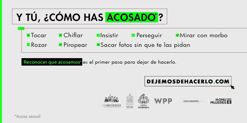 La Organización de las Naciones Unidas Mujeres, el Gobierno Federal y autoridades de Monterrey y Guadalajara lanzaron oficialmente la campaña ‘Dejemos de hacerlo’, dirigida a hombres para explicar qué es el acoso sexual en los espacios públicos y convocarlos a que dejen de hacerlo.