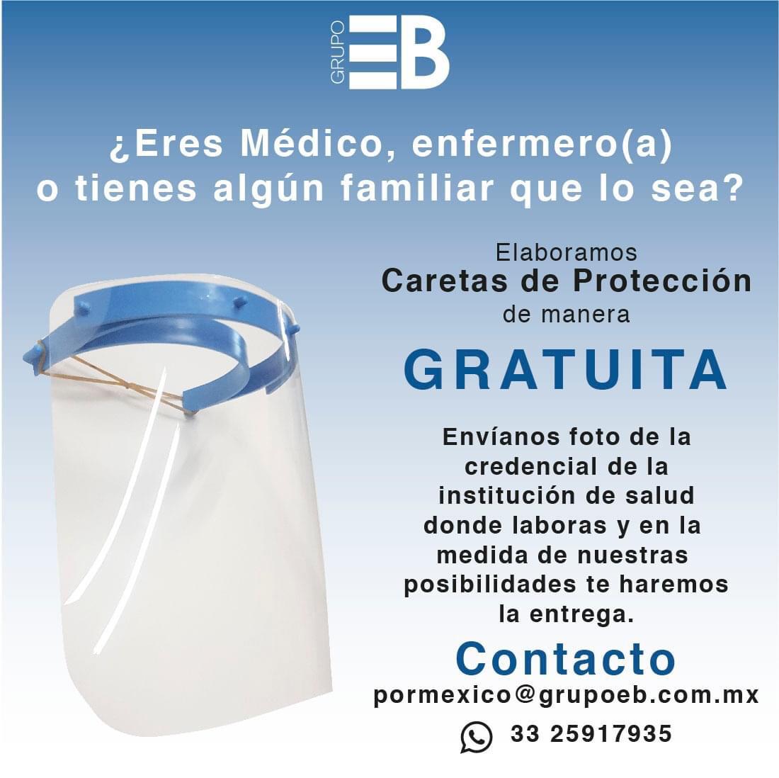 El grupo EB elabora caretas de protección de manera gratuita para el personal de salud. Hicieron un llamado para que si eres médico,enfermera o conoces a quien lo sea,  ponte en contacto con ellos enviándoles credencial de la institución de salud donde labora y Grupo EB le hará la entrega.
