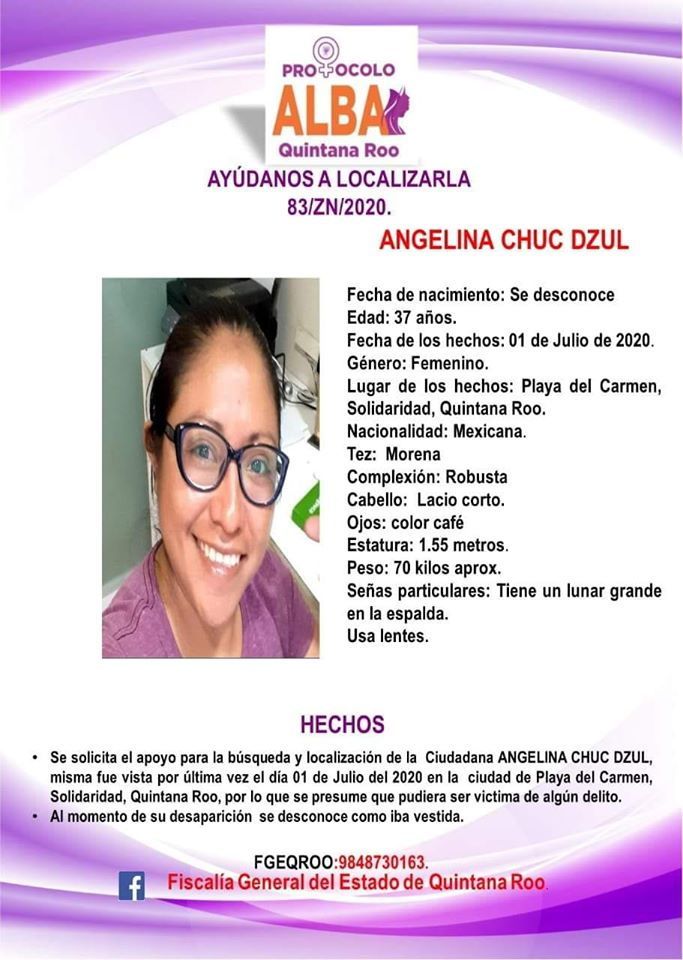 Fue reportada como desaparecida desde el 1 de julio, de su domicilio en Playa del Carmen y fue vista por última vez en el fraccionamiento Villamar I.