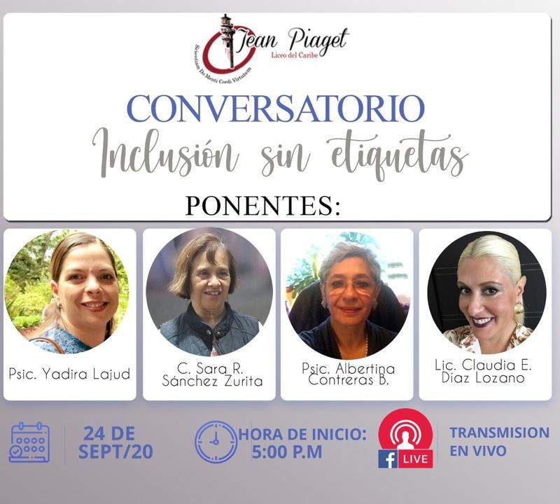 El Liceo del Caribe Jean Piaget hace una atenta invitación para que vean la transmisión del conversatorio “Inclusión sin Etiquetas” que se llevará a cabo el jueves 24 de septiembre a las 5:00 pm en la página del Liceo.